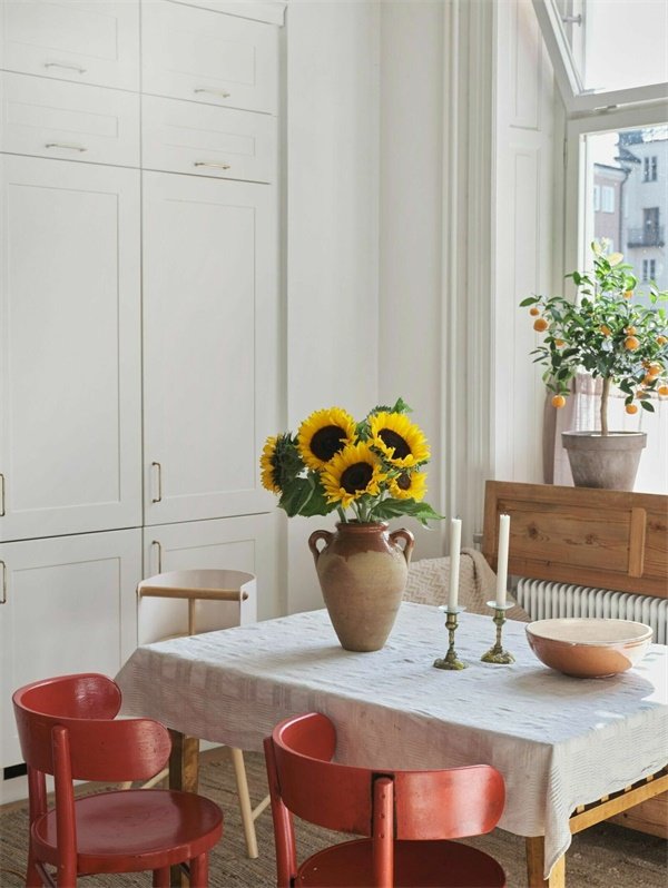 The old chairs can be given a whole new look with a bit of color—especially if you opt for a shade of red! Besides making the chair stand out in the interior, it also becomes a domestic element in warm tones in the dining area.