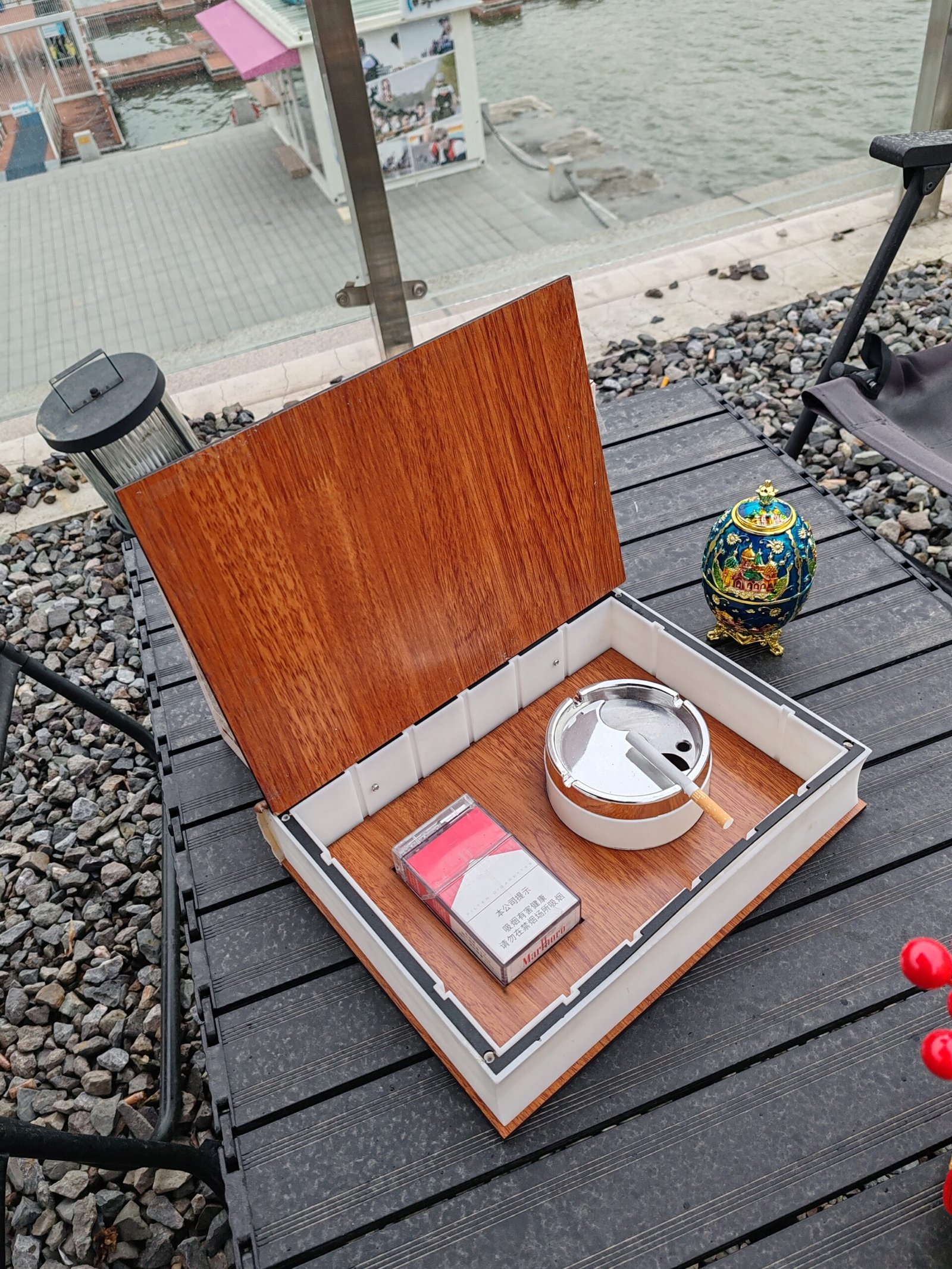 Book-shaped gift box, including acrylic cigarette case, lighter, ashtray.